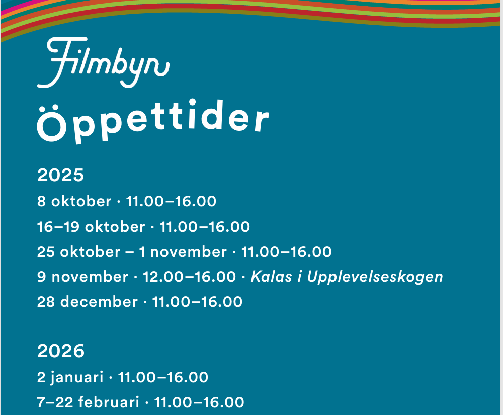 Nu finns våra öppettider Öppettider och priser – Filmbyn för resten av 2025 och hela 2026! Planera ditt besök i god tid och boka dina biljetter här på vår hemsida. Hoppas vi ses! PS. Missa inte kalaset i Upplevelseskogen på … Read More