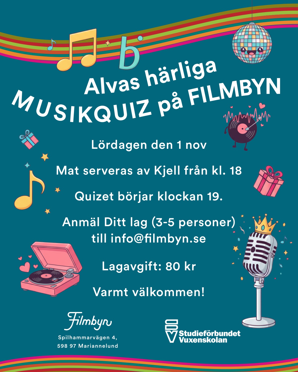🎶 Musik, quiz & härlig stämning i Filmbyn! 🎶 I samarbete med Vuxenskolan bjuder vi in till Alvas Musikquiz lördagen den 1 november!Kvällen startar kl. 18.00 med livemusik av Göran Nachtweij, och kl. 19.00 drar själva quizet igång. Samla ditt … Read More